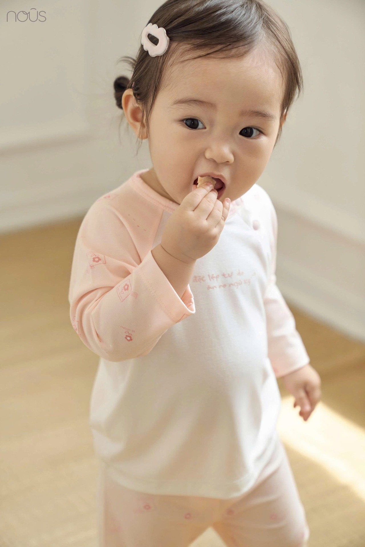 やわらかいコットン混素材を使った、ベビー用長袖トップス+パンツの上下セット。